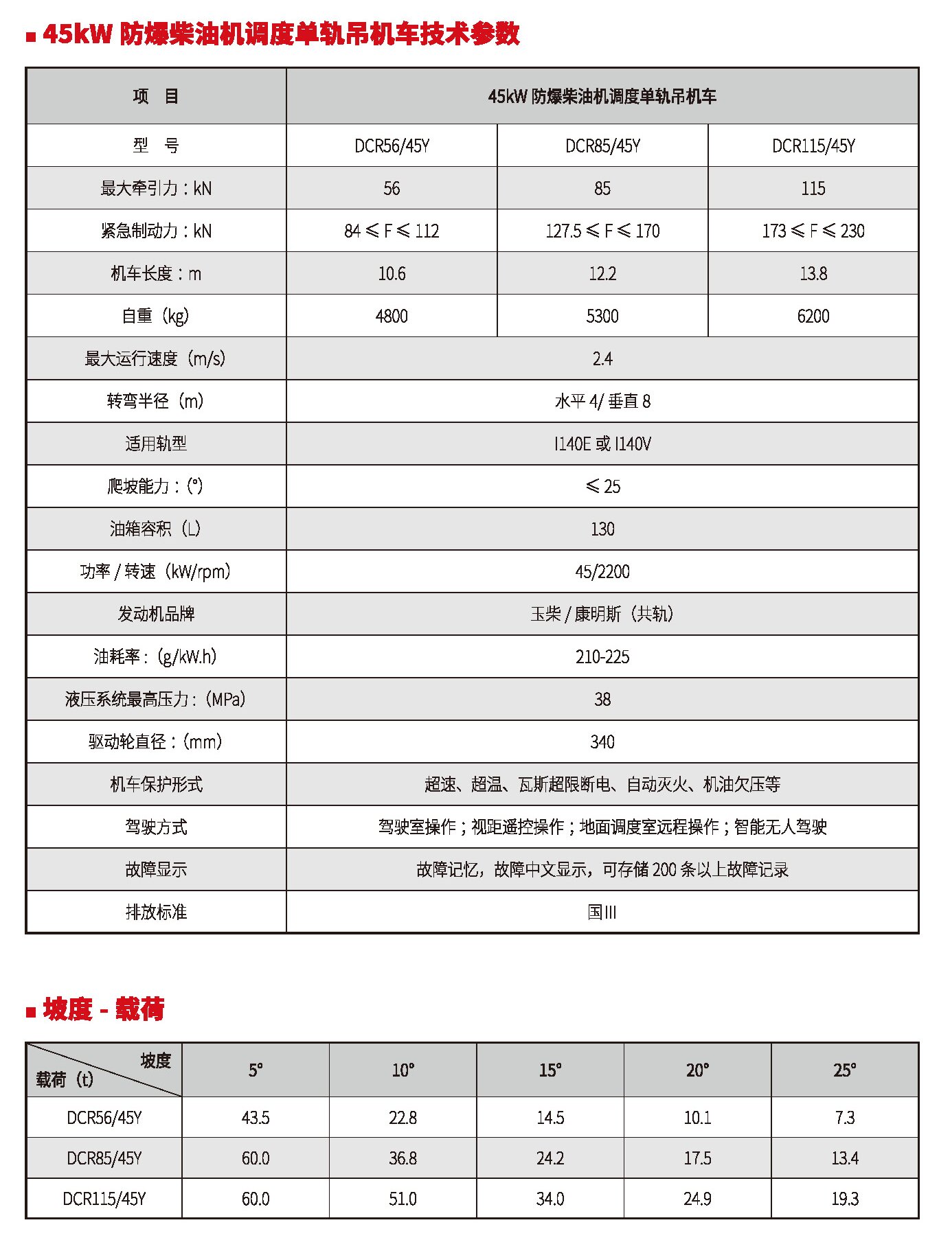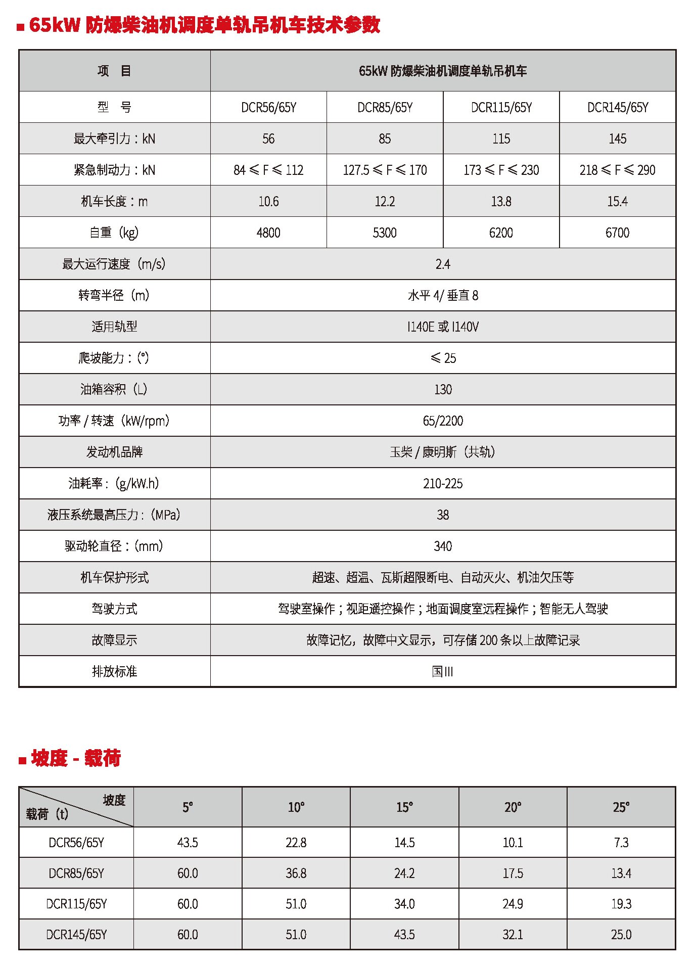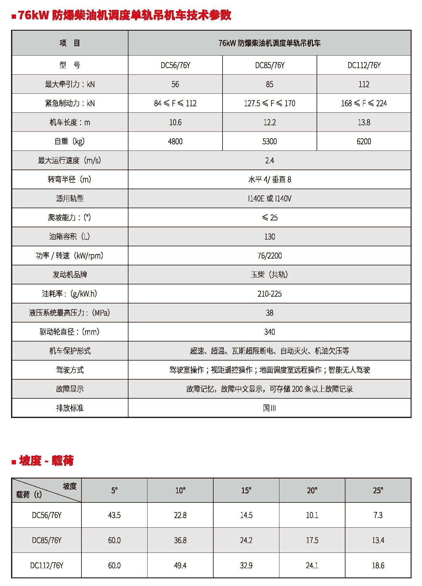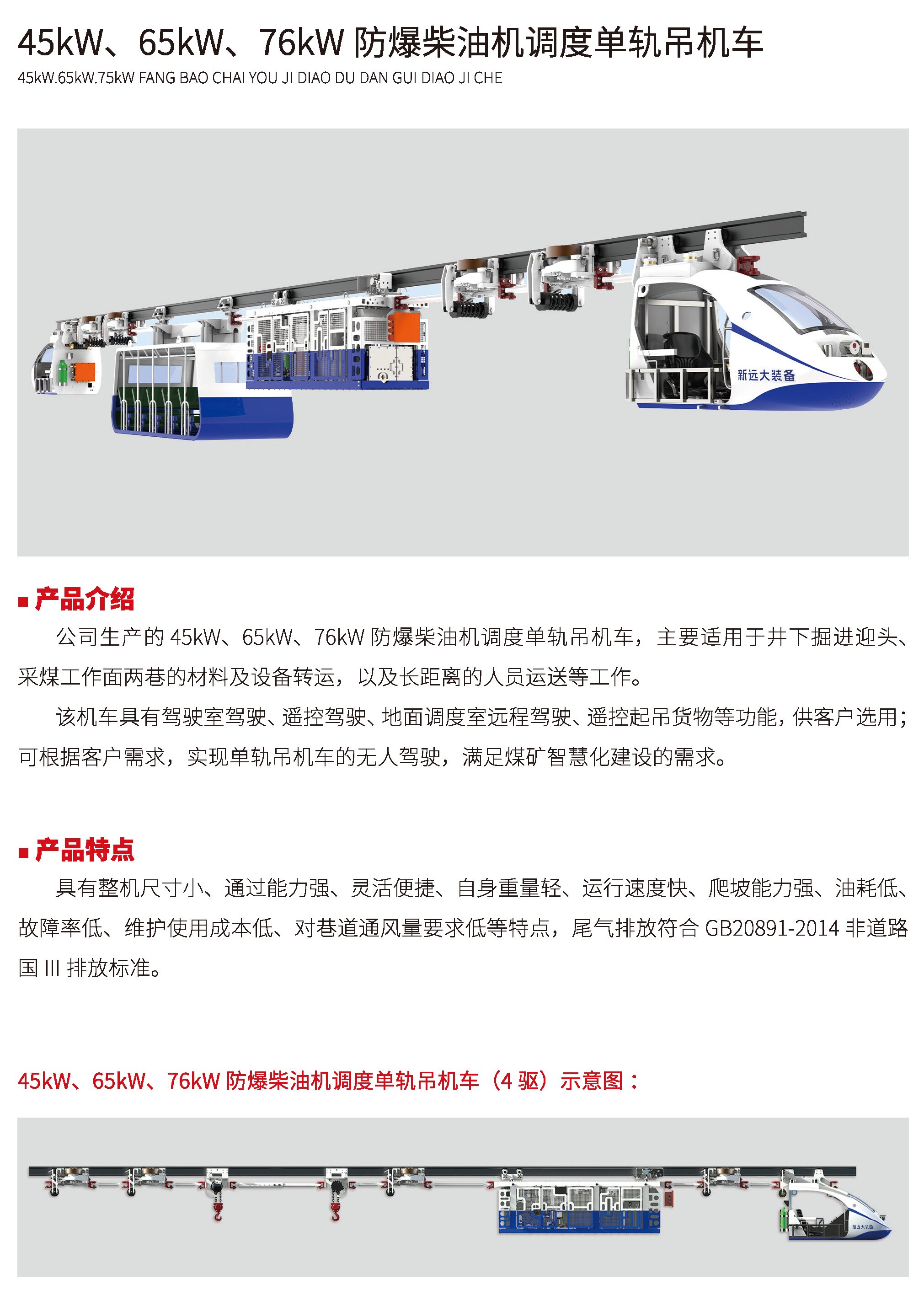 45kW、65kW、76kW防爆柴油機調(diào)度單軌吊機車(國Ⅲ、國Ⅳ)